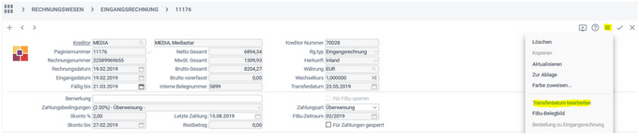 Sollte die Eingangsrechnung trotz Fibu Übertragungsdatum geändert werden (Steuerberater teilt z.B. mit, dass das falsche Konto bebucht wurde), müssen Sie erst das Übertragungsdatum entfernen. Diese Zusatzfunktion finden Sie oben rechts im Funktionsmenü.
