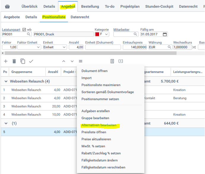 Markieren Sie genau eine Position in einem Angebot und rufen Sie dann über das Funktionsmenü der Position den Punkt "Alternativen bearbeiten" auf. Damit öffnet sich der Dialog.