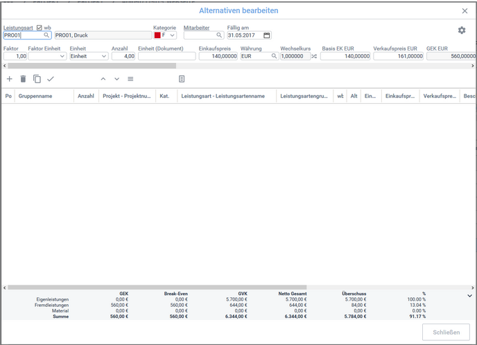 Der Alternativen-Dialog verhält sich wie der Positionen-Dialog.