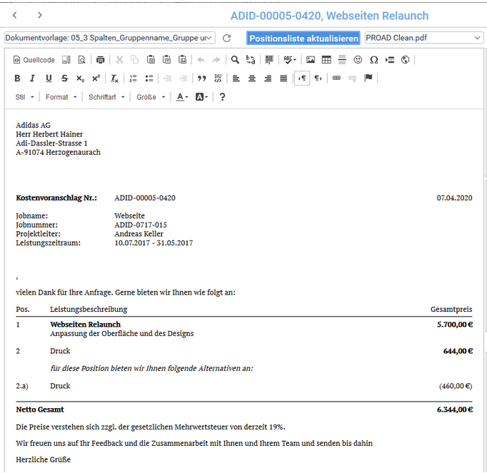 Hinweis: Bereits ausgedruckte Dokumente stimmen nach der Bearbeitung von Positionen nicht mehr mit den Daten in PROAD überein. Sie müssen deshalb das Dokument aktualisieren und danach erneut drucken oder als PDF erzeugen.