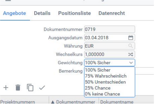 Um die Eintrittswahrscheinlichkeit für Angebote zu bestimmen und die daraus resultierenden gewichteten Nettobeträge gibt es das Feld "Gewichtung" im Bereich der Angebote. Dieses Feld ist in den Listen der Angebote und des Dokumentbrowsers verfügbar, es kann die Werte 0, 25, 50, 75 und 100 Prozent annehmen. Das gewichtete Angebotsvolumen wird entsprechend berechnet.