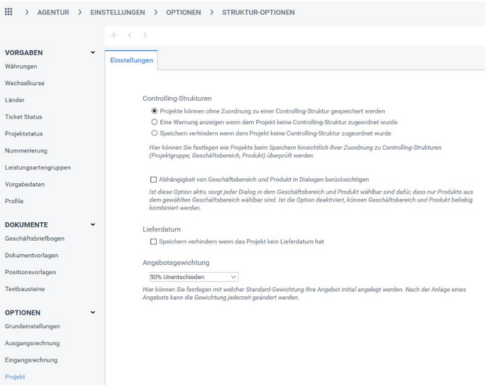 In den Agentur-Einstellungen (Agentur ❯ Einstellungen ❯ Optionen ❯ Projekt ❯ Einstellungen) kann ein Default-Wert definiert werden, welcher bei Anlage eines Angebotes greift. In den Standard-Einstellungen entspricht der Wert 100%.
