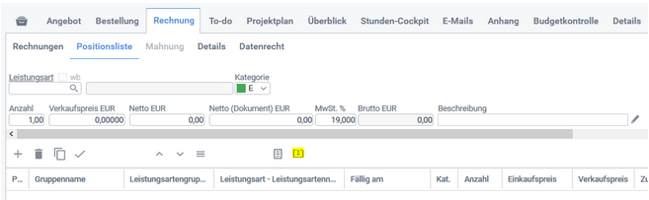 Die Rechnung hat jetzt die gleichen Positionen wie das Angebot des Projekts. Die Ausgangsrechnung kann jetzt gebucht werden. Hierzu eine Rechnungsnummer im Tab Rechnung, durch das kleine Häkchen neben dem Feld Rechnungsnummer, erzeugen (erst mit einer Buchhaltungslizenz möglich). Mit dem Buchen der Ausgangsrechnung werden die Erlöse ins Controlling weitergegeben.