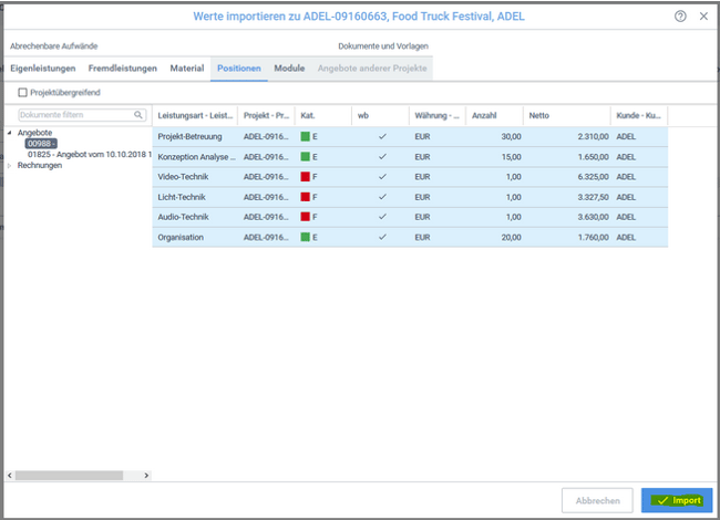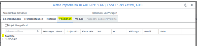 - Im Import-Bereich stehen nun von links an die erfassten Kosten zum Importieren zur Verfügung. Diese werden verwendet, um nach Aufwand abzurechnen. Hier nun in den Tab Positionen wechseln, hier befinden sich die Angebote aus diesem Projekt