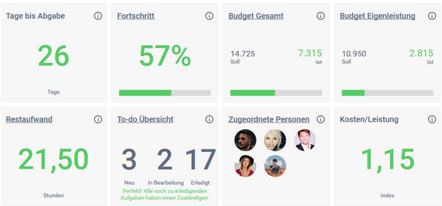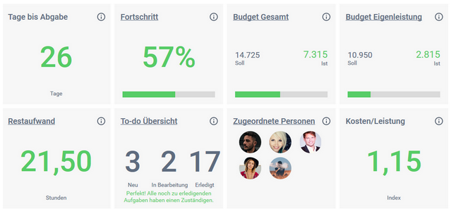 Zeigt die Anzahl der neuen, in Bearbeitung befindlichen und erledigten Aufgaben angezeigt. Die neuen Aufgaben haben den Status "Neu". Die Aufgaben in Bearbeitung sind all die, die "Begonnen", "Wartet" oder "Zurückgestellt" als Status tragen. Als erledigt werden die Aufgaben angezeigt, wenn sie den Status "Erledigt" oder "Abgebrochen" tragen. Darüber hinaus ist ersichtlich, ob alle im Projekt befindlichen Aufgaben einem Zuständigen zugeordnet sind oder noch nicht.