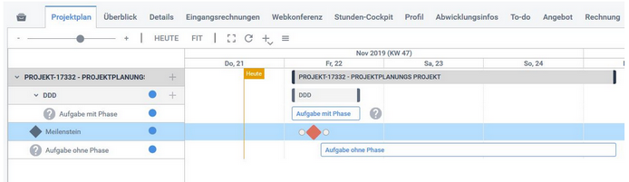 In der Aufgabenliste können Aufgaben über den Plus-Button im Projekt hinzugefügt werden. Der Button erzeugt bei einem Projekt eine Aufgabe und hängt sie direkt diesem Projekt an, bei einer Phase wird eine Aufgabe für diese Phase erzeugt.