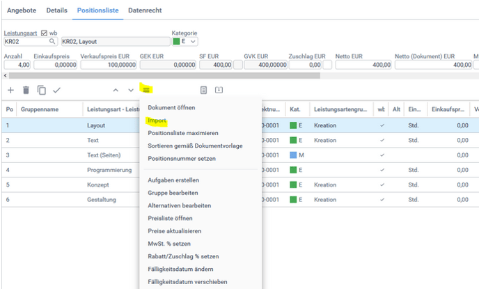 Damit richtig gruppiert werden kann, werden mehrere Positionen in der Positionsliste benötigt, dies geschieht durch die manuelle Eingabe der Positionen oder über den Punkt "Import" im Funktionsmenü.
