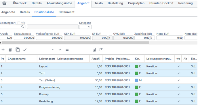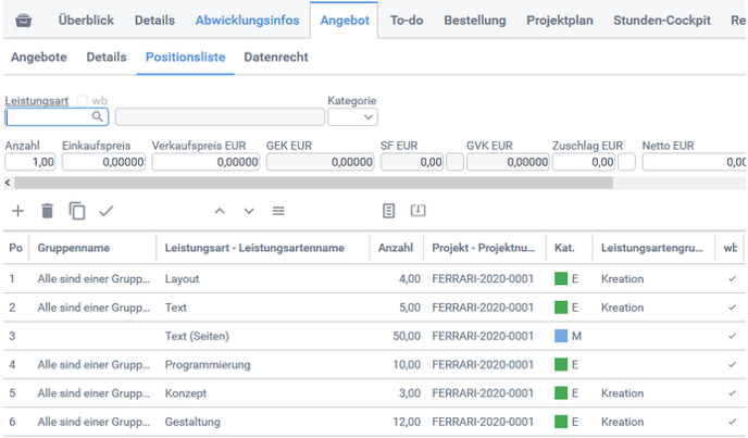 In Ihrer Positionsliste sehen Sie nun die Positionen mit dem entsprechenden Gruppennamen.
