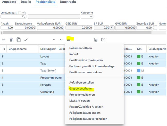 Es spielt keine Rolle, ob die Positionen bereits einen Gruppennamen haben oder ob sie unterschiedlichen Gruppen schon zugewiesen sind. Sie können die Positionen, bei denen Sie die Gruppe bearbeiten wollen, auswählen und im Funktionsmenü mit der Funktion "Gruppe bearbeiten" eine neue Gruppe bilden oder einer anderen vorhandenen Gruppe zuordnen.