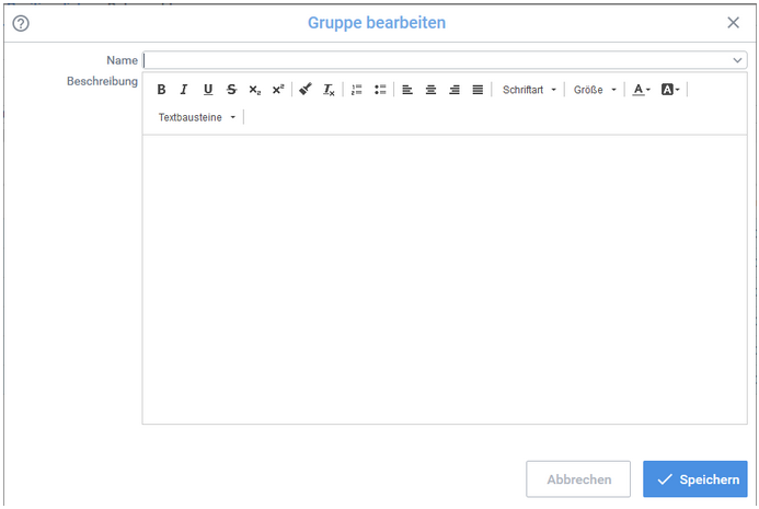 Es öffnet sich ein Dialog, in dem Sie den gewünschten Gruppennamen, sowie eine Beschreibung eingeben können. Mit dem Klick auf den Haken speichern Sie die Eingabe und der Dialog schließt sich.