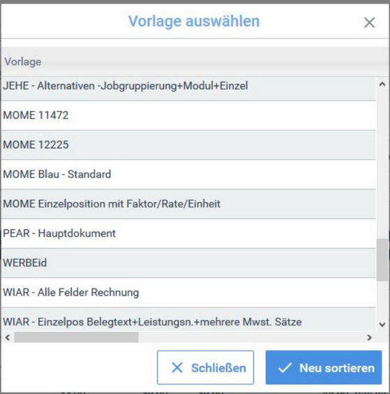 Es öffnet sich ein Overlay, in dem Sie Ihre gewünschte Dokumentvorlage auswählen können und dann auf den Button "Neu sortieren" klicken. Gemäß Ihrer gewählten Vorlage werden die Positionen in der Positionsliste neu sortiert.