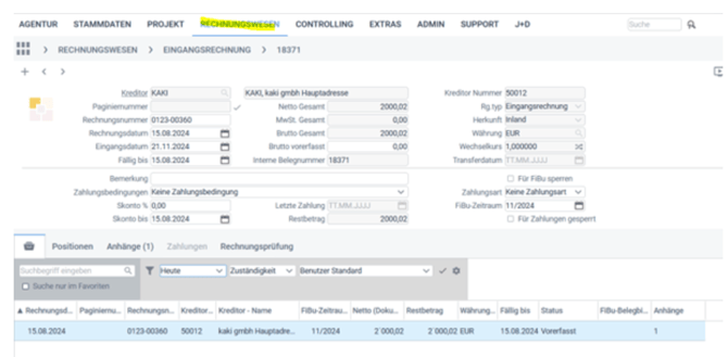 Wurden alle Pflichtfelder erfolgreich ausgelesen, wird die Eingangsrechnung in der Ansicht angezeigt und steht zur weiteren Bearbeitung bereit.
