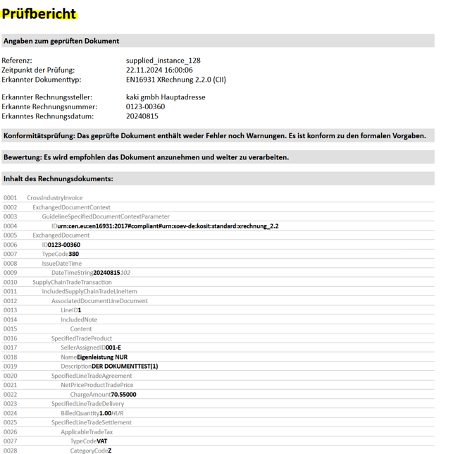 Ist die Rechnung nicht valide, weist das Protokoll die fehlenden Pflichtfelder aus. Das Protokoll kann kopiert und dem Lieferanten als Hinweis weitergeleitet werden.