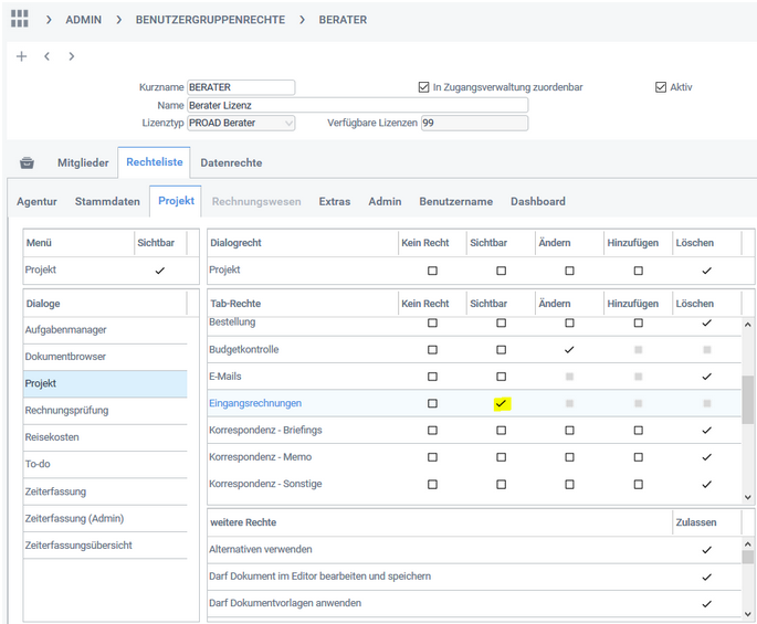 Hierzu gehen Sie in den Bereich Admin > Benutzergruppenrechte > Bsp. Berater > Rechteliste > Projekt > Projekt > Eingangsrechnungen und setzen den Haken bei "Sichtbar".