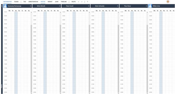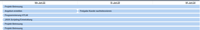 - Timeline: Zeigt in einer Übersicht die Termine und Aufgaben für alle ausgewählten Mitarbeiter/Freelancer im Zeitverlauf an.