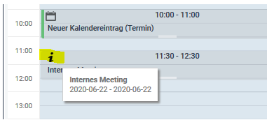 Wenn Sie mit der Maus über das Kalender-Symbol eines Termins fahren, ändert sich das Icon. Wenn Sie jetzt klicken, öffnet sich die Visitenkarte des Termins mit zusätzlichen Informationen.