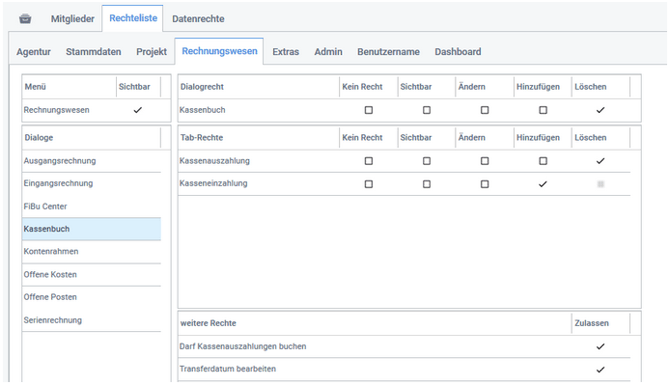 - Benutzerrecht: Rechteliste > Rechnungswesen > Kassenbuch