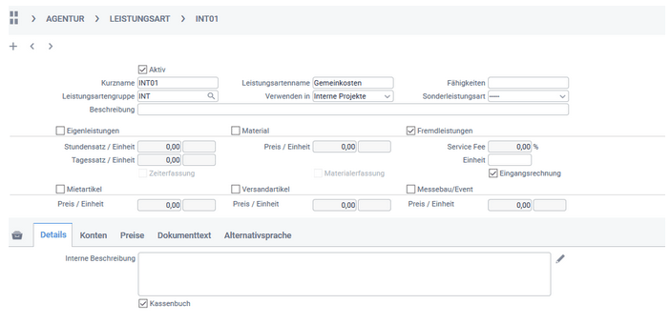 Um die Leistungsarten, die unter Agentur > Leistungsart erfasst wurden, im Kassenbuch verwenden zu können, muss die Leistungsart im Tab "Details" zusätzlich über die Checkbox „Kassenbuch“ gekennzeichnet und eine Beschreibung hinterlegt werden. Die Beschreibung wird als Belegtext vorgeschlagen und kann bei der Erfassung bei Bedarf angepasst werden.