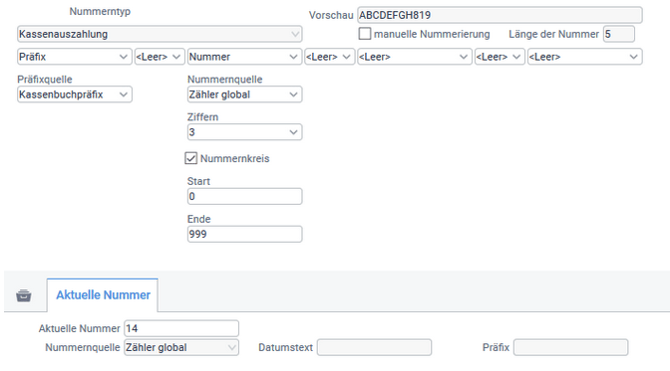 Bei jeder Kassenauszahlung (Belegerfassung) muss eine eindeutige Nummer vergeben werden. Die Art der Nummerierung können Sie unter Agentur > Einstellungen > Vorgaben > Nummerierung > Nummerntyp „Kassenauszahlung“ vornehmen.