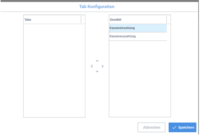 Um eine Kasseneinzahlung zu erfassen, muss zunächst die gewünschte Kasse ausgewählt werden. Nachdem die Auswahl getroffen wurde, stehen die Tabs Kasseneinzahlung und Kassenauszahlung zur Verfügung. Sollte dies nicht der Fall sein, so können Sie mit rechtem Mausklick in die Tab-Zeile die Tab-Konfiguration öffnen und die gewünschten Tabs zur Anzeige auswählen.