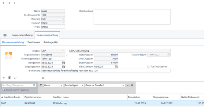Dieser Lieferant kann dann für alle Kassenauszahlungen ausgewählt werden. Kassenauszahlungen werden trotzdem beim Fibu Transfer mit übergeben, da wir bei der Neuanlage der Kasse den Kreditor hinterlegt haben. - Paginiernummer: Diese Nummer wird automatisch generiert oder manuell eingegeben, je nachdem, wie Sie die Nummerierung eingestellt haben. Die Nummer kann erst generiert werden, wenn mindestens eine Belegposition erfasst wurde.