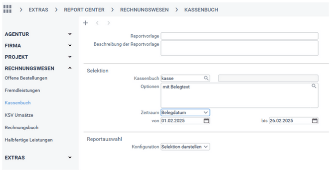 Um ein Kassenbuch zu erstellen, wechseln Sie bitte zu Extras > Reportcenter > Kassenbuch. Nach Auswahl der Kasse (Klick auf die Lupe) erstellt die Standardeinstellungen ein Kassenbuch vom 1. Januar bis zum aktuellen Tag.