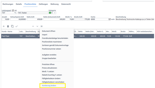Die Funktion "Kontierung ändern" finden Sie im Funktionsmenü der Positionsliste.