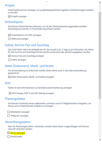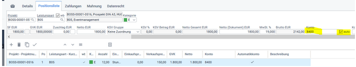 In den Positionslisten stehen zudem die Felder "Konto" und "auto" pro Position zur Verfügung.