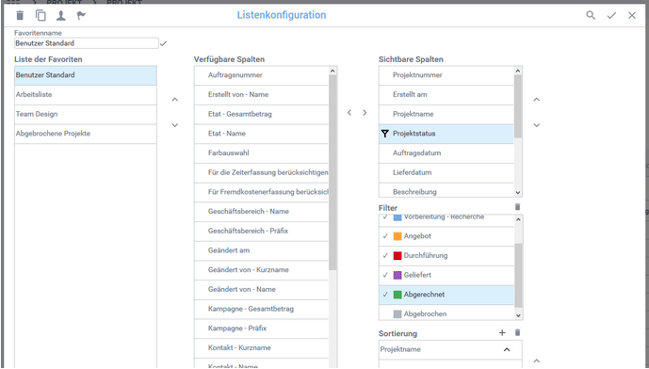 Um diese Projekte aus der aktuellen Projektliste (Favoritenliste mit Filter für Projektstatus „Vorbereitung“, „Angebot“) herauszubekommen, setzen sie den Status bitte auf „Abgebrochen“. Anschließend können Sie Ihren Favoriten "Benutzer Standard" zum Beispiel so filtern, dass dieser die Projekte mit dem Status abgebrochen nicht mehr anzeigt.