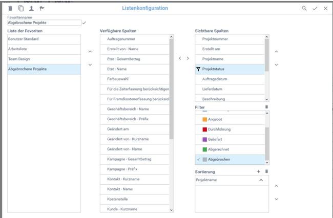Eine Übersicht der abgebrochenen Projekte erhalten Sie dann zum Beispiel mit einem entsprechenden Filter, der nur noch den Projektstatus "Abgebrochen" filtert.