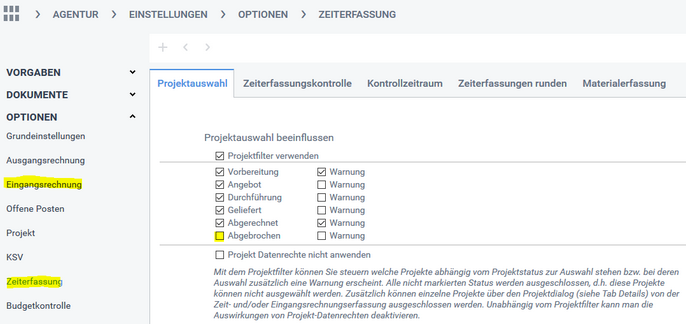 Damit diese abgebrochenen Projekte nicht mehr für die Kostenerfassung von Eingangsrechnungen und Zeiten zur Verfügung steht, können Sie die Agentureinstellungen im Bereich Optionen > Zeiterfassung/ Eingangsrechnen entsprechend anpassen.