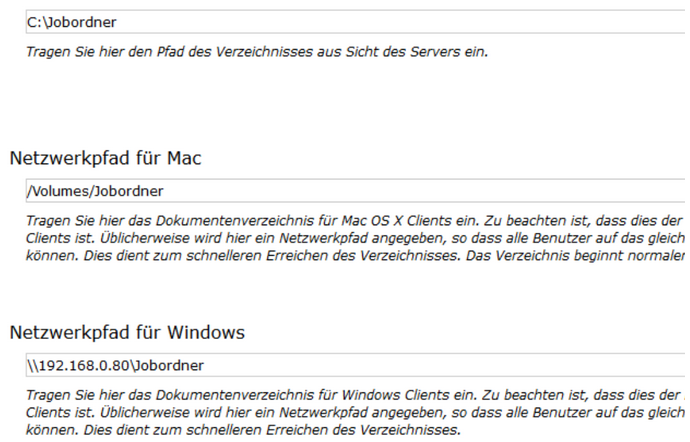 „Netzwerkpfad für Windows“: Tragen Sie hier den Pfad zum Serververzeichnis ein, wenn Sie mit einem Windows-Client auf den Projektordner zugreifen möchten.