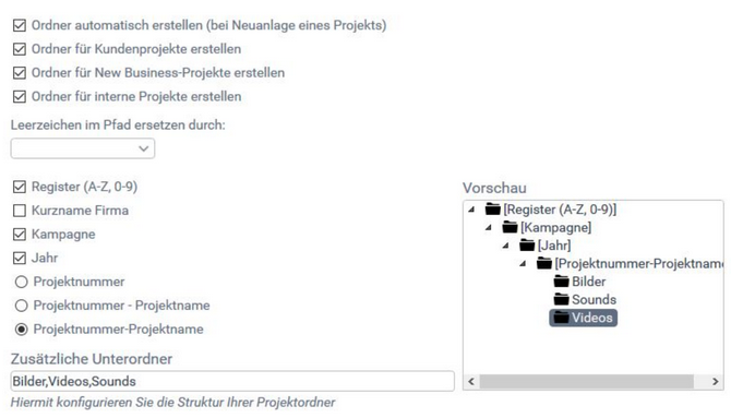 Es kann für alle Projekttypen , "New Business", "Intern" und "Kundenprojekte", einzeln angegeben werden, ob die Projektordner Funktionalität unterstützt wird.