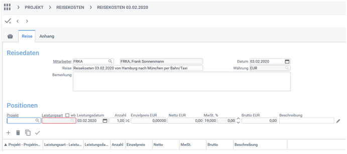 1. Wechseln Sie in der Reisekostenerfassung in den Bereich "Positionen" und geben ihre Projektnummer und Leistungsart an.