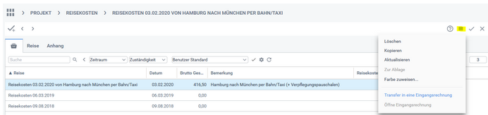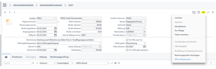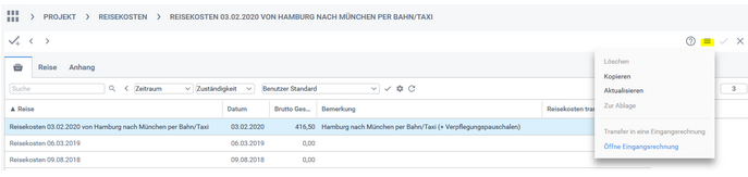 Um zwischen der zusammenhängenden Eingangsrechnungen und Reisekosten zu wechseln, stehen in den Funktionsmenüs die Funktionen „Öffne Eingangsrechnung“ bzw. "Öffne Reisekosten" zur Verfügung.