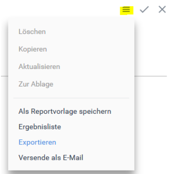 Info: Über das Funktionsmenü in der oberen rechten Ecke können neben der Reportvorlagenspeicherung weitere Funktionen ausgeführt werden, wie zum Beispiel den Report zu Excel exportieren. Mit dieser Funktion können Sie die Daten direkt in Excel weiterverarbeiten.