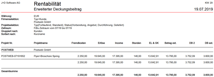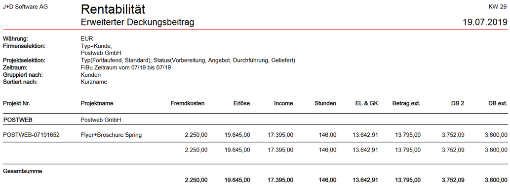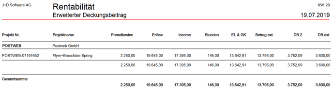 Die Auswertung der Rentabilität ermöglicht einen genauen Überblick, über Kunden und die dazugehörigen Projekte. Dabei werden die Deckungsbeiträge I und II ausgewiesen. Der Deckungsbeitrag I zeigt an, was nach Abzug aller direkten Kosten (Fremdkosten und direkte Personalkosten) an Über- bzw. Unterdeckung erzielt wurde. Der Deckungsbeitrag II berücksichtigt einen anteiligen Gemeinkostenzuschlag und zeigt somit die Über- bzw. Unterdeckung nach Abzug aller Kosten des Unternehmens.