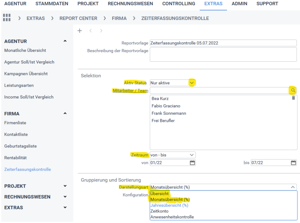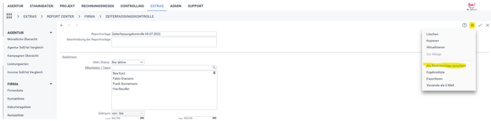 Diesen Report finden Sie über: Extras > Report Center > Firma > Zeiterfassungskontrolle.