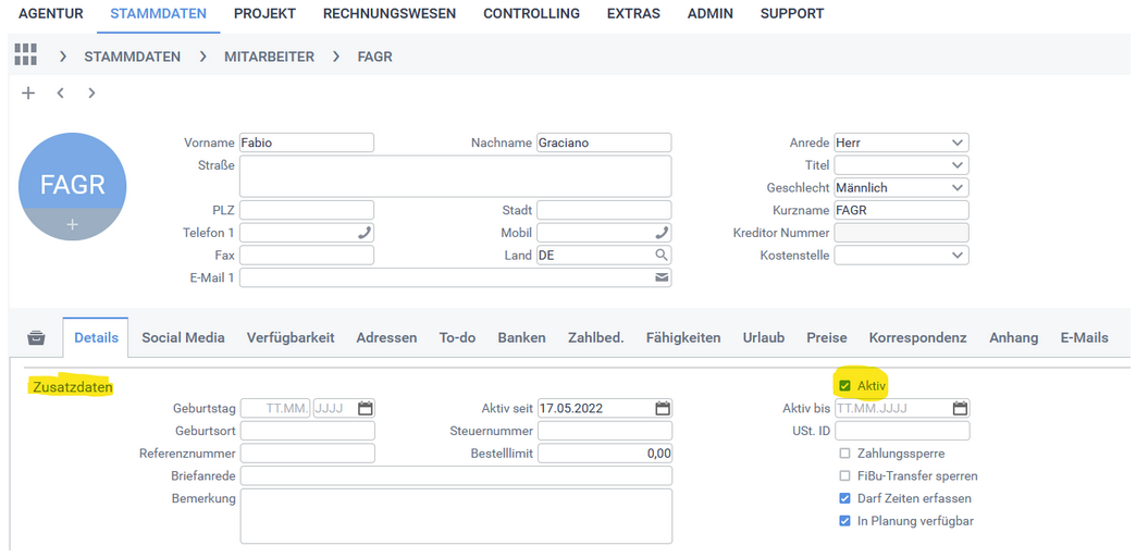 Hinweis: Der Status des Mitarbeiters (aktiv/inaktiv) wird im Bereich Stammdaten > Mitarbeiter > Details > Zusatzdaten gesetzt.