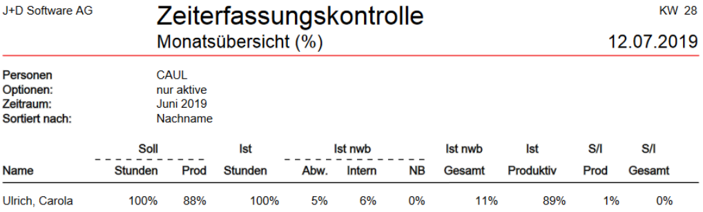 Die Mitarbeiterin hat eine Verfügbarkeit von 8 Stunden pro Tag und davon sollen 7 Stunden produktiv, sprich an Kundenprojekten, gearbeitet werden. Dies ergibt die 100% Soll-Stunden und die 88% Soll-Produktivstunden. Sie hat 100% ihrer Ist-Stunden erfasst. Davon sind 11% nicht weiterberechenbar, welche sich in diesem Beispiel aus 5% Abwesenheit und 6% interner Administration zusammensetzt. Da mit der Verfügbarkeit bereits gesetzt wurde, dass die Mitarbeiterin 12% nicht weiterberechenbare Zeitaufwende hat (100-88), ist sie 1% produktiver als veranschlagt. Soll zu Ist der Gesamtstunden sind 0%, da sie die veranschlagten 8 Stunden pro Tag erfasst hat. "NB" sind New Business Stunden, die nicht weiterberechenbar sind. Zusätzlich wird ersichtlich, wie ausgelastet ein Mitarbeiter ist und ob Über- oder Unterstunden erfasst wurden.