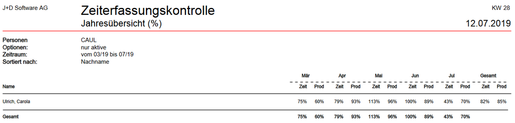 Durch diese Darstellung wird ersichtlich, wie die Produktivität und Auslastung eines Mitarbeiters sich über die Monate verändert. Hierfür werden die prozentualen Ist-Stunden und Ist-Produktivzeiten je Monat angezeigt. Am rechten Rand wird der Durchschnitt des Mitarbeiters ausgewiesen. Am unteren Rand wird der Durchschnitt je Monat über alle Mitarbeiter hinweg angezeigt.