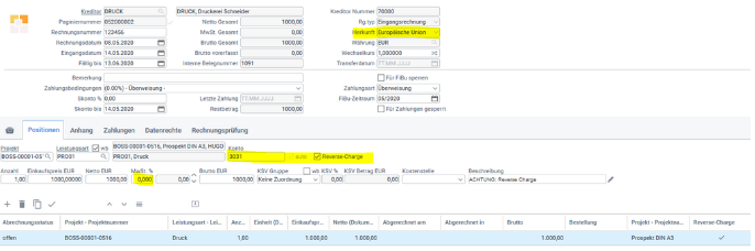 Wenn Sie auf der Position einen Steuersatz ungleich 0 % angeben und das Reverse-Charge-Verfahren aktivieren, wird dieser Steuersatz für die Buchung nicht berücksichtigt. Die Steuerbuchung verhält sich dann so, als hätten Sie eine Steuer von 0% angegeben.