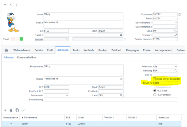 Ebenfalls ist es möglich, je Debitor und Kreditor einen abweichenden Steuersatz zum Standardsteuersatz der Agentur zu hinterlegen. Dies geschieht auf dem Tab „Adressen“. Wählen Sie hierzu die Hauptadresse der Firma aus und aktivieren Sie die Checkbox „Diese MwSt. anwenden“. Dann tragen Sie in dem Feld den gewünschten Mehrwertsteuersatz ein, den Sie bei der Erfassung von Belegen zu diesem Debitor oder Kreditor vorgeschlagen bekommen möchten. Dies kann Beispielsweise bei Firmen im Ausland mit 0% MwSt. relevant sein.