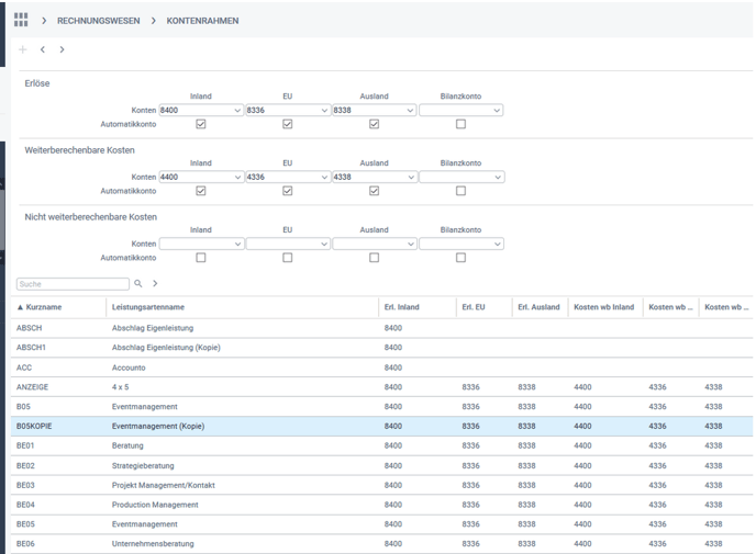 2. Hinterlegung der Sachkonten auf Leistungsartebene
