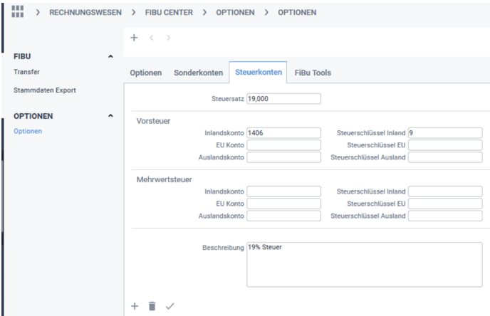 Unter Rechnungswesen > Fibucenter > Optionen stehen die Tabs „Sonderkonten“ und „Steuerkonten zur Verfügung. Legen Sie zunächst die Steuerkonten an. Klicken Sie hierzu auf die Tab und „Steuerkonten“. Geben Sie im obersten Feld den Steuersatz (ohne %-Zeichen!) an, den zu dem Sie die Steuerkontodaten anlegen möchten und speichern dann über den Haken oberhalb des unteren Listenbereichs. Erfassen Sie hier die Einträge für alle von Ihnen verwendeten Steuersätze.