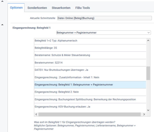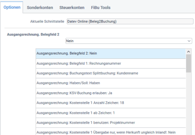 Unter Rechnungswesen > Fibucenter > Optionen stehen, je nach verfügbarer Schnittstelle, verschiedenen Einstellungsmöglichkeiten zur Verfügung, wie die Daten an die Schnittstellendatei übertragen werden sollen. Um die Optionen einzustellen, wählen Sie einen Eintrag aus der Liste aus und geben im Bereich oberhalb der Liste die gewünschten Werte/Informationen an.