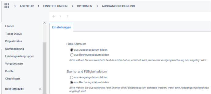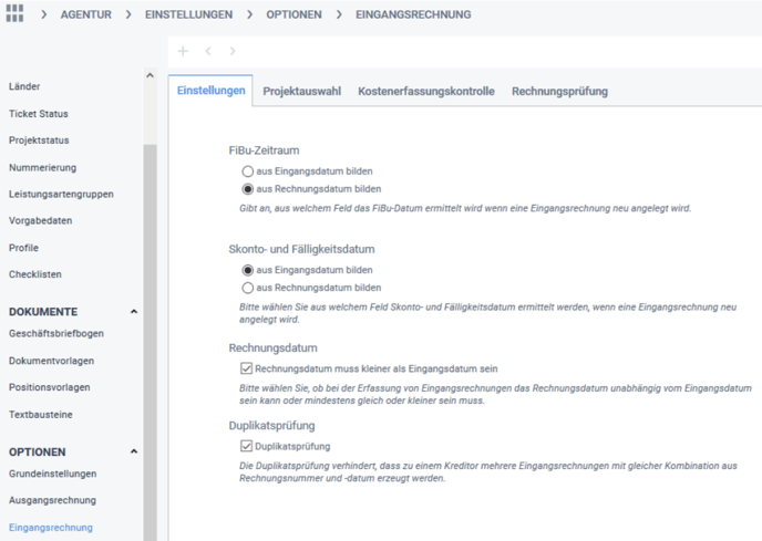 Die Einstellungen stehen unter Agentur > Einstellungen > Optionen > Eingangsrechnungen bzw. Ausgangsrechnungen zur Verfügung.