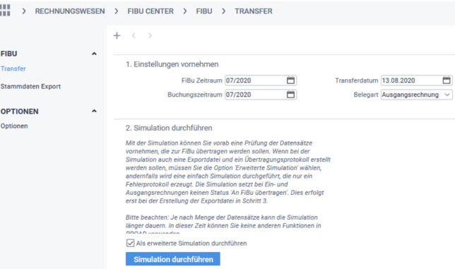 Sie sollten vor dem 3. Schritt: "Exportdatei erstellen", die Simalution durchführen. Mit der Simulation können Sie vorab eine Prüfung der Datensätze vornehmen, die zur Fibu übertragen werden sollen.