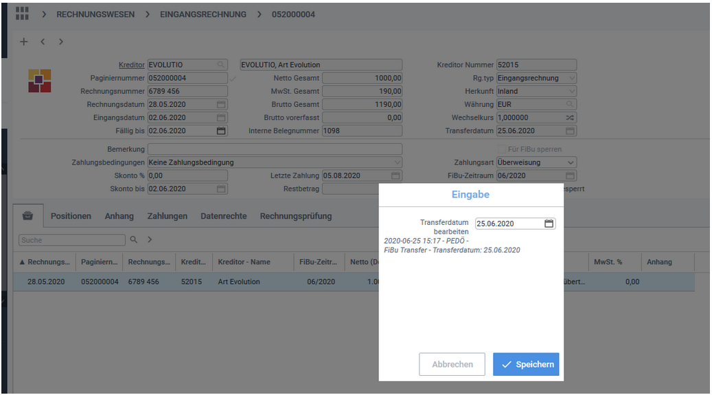Dieses Datum wird dann in die Rechnungen zurückgeschrieben, wenn Sie den Transfer verbuchen.