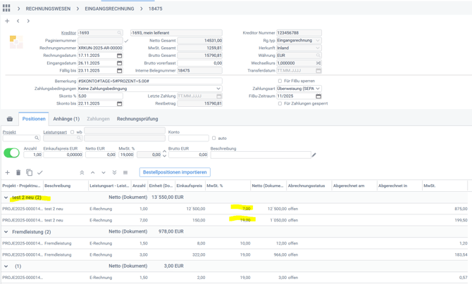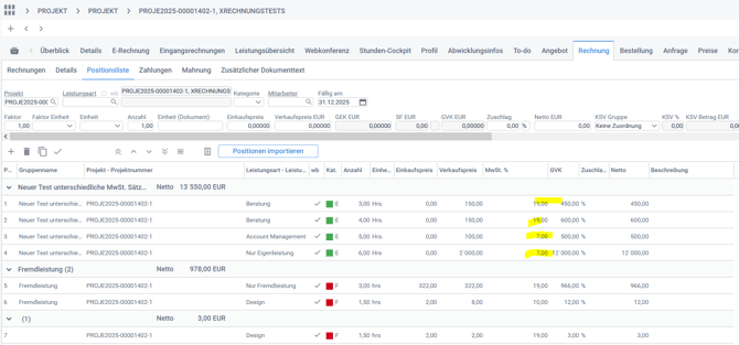 Die Gruppe wird zweimal ausgewiesen, einmal mit einer Gruppierung nach 19 % MwSt. und einmal nach 7 % MwSt.